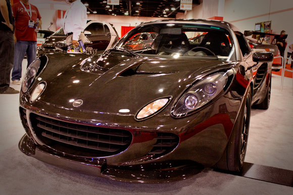 One of our most popular articles ever was on Jimmy Wong’s all raw carbon fiber Lotus Elise. While attending SEMA this year, Seibon, an aftermarket parts manufacturer that specializes in carbon fiber, also had an all carbon fiber Elise in their booth: