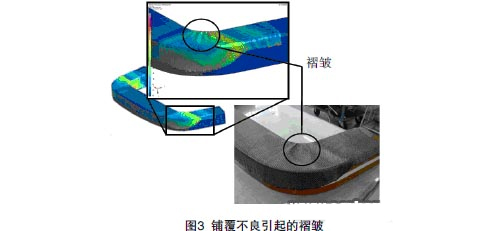預(yù)浸料在曲面上的鋪覆過(guò)程會(huì)對(duì)增強(qiáng)體造成剪切和擠壓,從而導(dǎo)致纖維鋪設(shè)角度發(fā)生變化,當(dāng)剪切角超過(guò)預(yù)浸料的極限角時(shí)甚至可能引起褶皺(圖3)。纖維角度的 變化會(huì)引起局部熱膨脹系數(shù)和模量的改變,從而對(duì)最終的翹曲變形和殘余應(yīng)力分布造成影響。顯然,鋪覆作用的影響程度受工件幾何形貌的影響,對(duì)于曲率較大的工 件,這種作用的影響相對(duì)顯著。