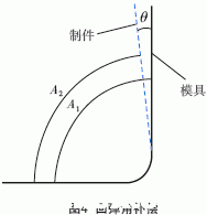 除模具的膨脹對(duì)制件固化變形有影響外,復(fù)合材料制件因?yàn)殇亴雍徒Y(jié)構(gòu)的不對(duì)稱性,以及材料本身的固化特性,在固化時(shí)產(chǎn)生內(nèi)應(yīng)力也將引起制件變形。而對(duì)于梁、長桁類有大夾角的零件,固化變形最顯著的是回彈角,即制件在固化脫模后,夾角因收縮而小于模具角度,此差值為回彈角。如圖4所示,A1為模具夾角,A2為制件脫模后的夾角,θ為二者之差,即回彈角。在設(shè)計(jì)時(shí),不考慮回彈角或考慮不當(dāng),將對(duì)制件質(zhì)量產(chǎn)生較大影響,特別是對(duì)裝配的影響。 123,123