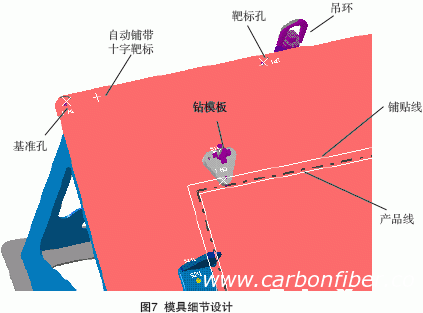 (4) 靶標(biāo)孔:用于手動(dòng)鋪貼時(shí)放置激光投影的靶標(biāo),以定位鋪層區(qū)域。靶標(biāo)孔按實(shí)測值即可,坐標(biāo)值刻于模具上。