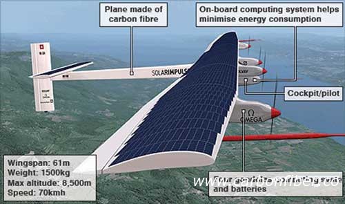 “陽光動力號”飛機原型的機翼類似空客A340,長63.4米,其上集成了200平方米的光伏電池面板,由12000塊厚度僅為180微米的單晶硅光伏電池板組成,晝夜均可飛行。飛機主架結構采用含碳素纖維和蜂巢的復合材料,以三明治式夾層法壓制合成,機身僅重1500公斤,比傳統(tǒng)飛機輕1600公斤 “陽光動力號”于21日開始在瑞士東部迪本多爾夫進行模擬飛行。項目團隊聲稱,這次測試將由項目聯合創(chuàng)始人和飛行員來評估駕駛艙的配置和飛行數天對人體的影響。這架覆蓋著光伏電池、僅由太陽能提供動力的太陽能樣機曾于2011年年中在歐洲完成了一系列飛行,并且還在布魯塞爾和巴黎航空展上亮過相。