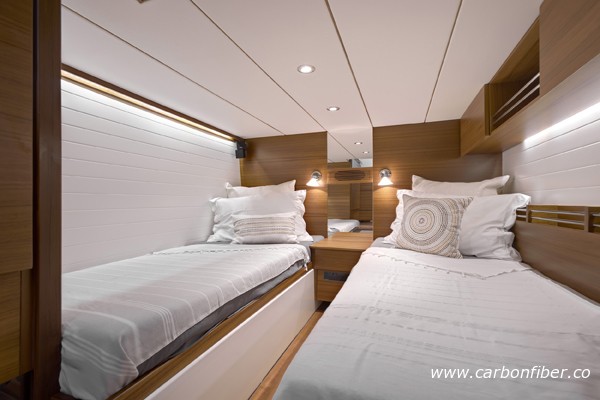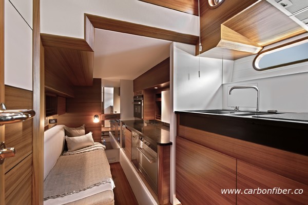據(jù)了解,目前市場上很多船都標榜“碳纖維”,但事實上大部分都只有小區(qū)域用了碳纖維而其他區(qū)域只是一般的纖維組合。Delta 54 是全球第一艘100%使用碳纖維的游艇,除了船體外,室內(nèi)柜子門、隔艙板及地板等附屬設(shè)施均由碳纖維打造。