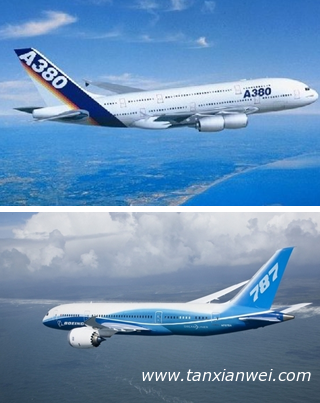 使用碳纖維材料的空客A380和波音787