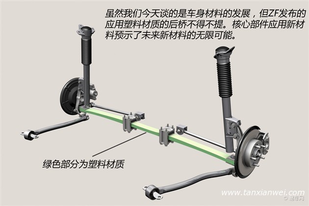 除了傳統(tǒng)的汽車外飾件,塑料材質(zhì)應用的極致案例要數(shù)ZF推出的纖維強化塑料的后橋系統(tǒng)了。核心部件應用塑料材質(zhì),代表著塑料在未來汽車領(lǐng)域的無限可能。