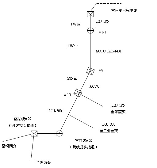 增容改造實(shí)施:將常州變出線前段架空線的主線原LGJ-185導(dǎo)線更換為ACCC導(dǎo)線,長度1.8km。