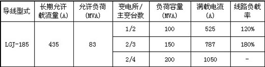 原LGJ-185導(dǎo)線只能滿足帶一個變電所2臺主變的要求,遇故障或檢修,帶3臺50MVA主變,需輸送787A,LGJ-185導(dǎo)線就已不能承擔(dān)。導(dǎo)線輸送容量的限制給電網(wǎng)運(yùn)行方式的靈活調(diào)整帶來困難。