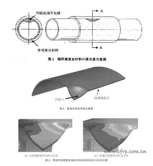經(jīng)有關(guān)部門研究決定采用碳纖維復(fù)合材料補(bǔ)強(qiáng)技術(shù)對(duì)此管道進(jìn)行搶修。首先使用填平樹(shù)脂對(duì)凹陷進(jìn)行填平修復(fù)處理,然后纏繞高強(qiáng)度碳纖維復(fù)合料(見(jiàn)圖1)。