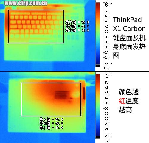 對于整機(jī)的發(fā)熱量來說,由于ThinkPad X1 Carbon機(jī)身過于纖薄,這導(dǎo)致其機(jī)身表面部分區(qū)域存在熱量堆積,在室溫25℃,經(jīng)過30分鐘拷機(jī)測試以后,其鍵盤面左側(cè)溫度52.9℃,機(jī)身底部散熱孔附近最高溫度達(dá)到57.3℃,大家使用時(shí)應(yīng)避免將其放在柔軟的物體表面堵塞出風(fēng)孔影響散熱。