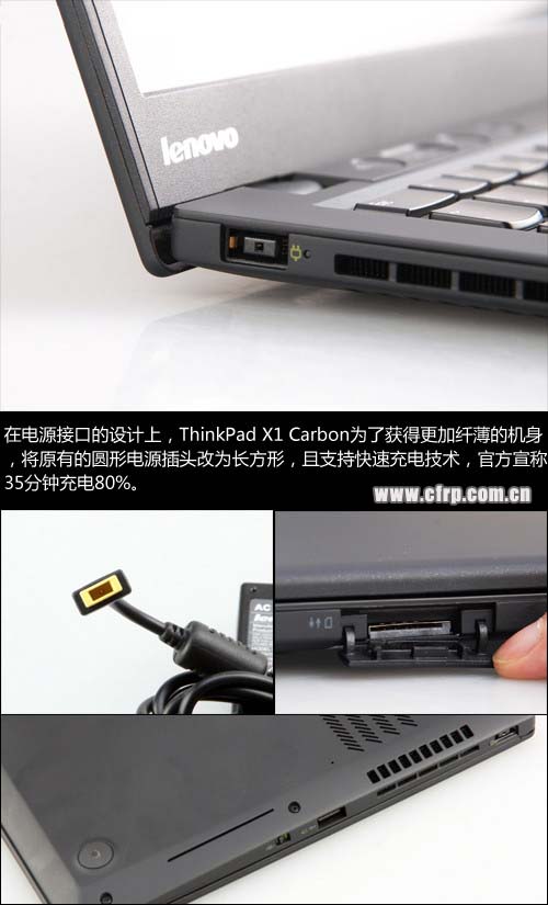 在電源接口的設(shè)計(jì)上,ThinkPad X1 Carbon為了獲得更加纖薄的機(jī)身,將原有的圓形電源插頭改為長方形,且支持快速充電技術(shù),官方宣稱35分鐘充電80%。