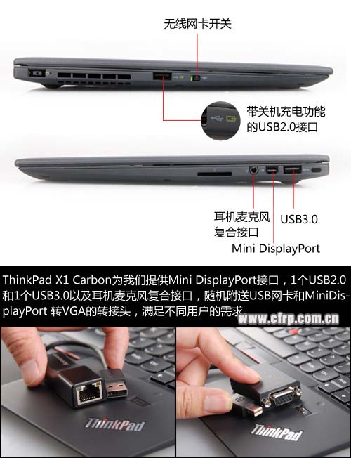 在整機(jī)擴(kuò)展性上,ThinkPad X1 Carbon為我們提供了Mini DisplayPort 接口,1個(gè)USB2.0和1個(gè)USB3.0以及耳機(jī)麥克風(fēng)復(fù)合接口,隨機(jī)附送USB網(wǎng)卡和Mini DisplayPort 轉(zhuǎn)VGA的轉(zhuǎn)接頭,滿足不同用戶的需求。不過在眾多接口中特別值得一提的是Mini DisplayPort 接口,它可實(shí)現(xiàn) 2560×1600 分辨率的外接顯示屏的擴(kuò)展,而帶有電池標(biāo)示的USB接口支持關(guān)機(jī)充電功能。