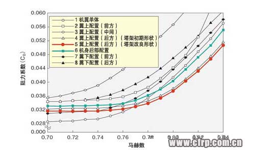讓我們?cè)賮砜磮D2。通過改變引擎的配置方式(前後方向的安裝位置),馬赫數(shù)與阻力係數(shù)的關(guān)係會(huì)發(fā)生變化。翼上配置時(shí),阻力係數(shù)總體上高於單獨(dú)機(jī)翼,但配置在某個(gè)位置時(shí)卻出現(xiàn)了縮小。那就是引擎短艙尖端部的前後位置配置在機(jī)翼上表面發(fā)生的衝擊波附近的時(shí)候(圖中4、5)。如果從這個(gè)位置略微偏向前方,阻力係數(shù)就會(huì)猛增(圖中3)。與引擎配置機(jī)身後部的以往商用噴射飛機(jī)的做法相比,配置在這個(gè)位置時(shí)的阻力係數(shù)要小得多(圖中6)。
