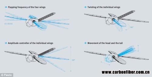 BionicOpter能夠朝著任何方向飛行,甚至能夠盤旋,就像真正的蜻蜓一樣。費斯托公司表示BionicOpter的4個翅膀采用碳纖維和箔材料,每秒可振翅20次,驅動蜻蜓在空中飛行。確切地說,它的飛行動作更像是游泳。BionicOpter的翼展達到63厘米,體長44厘米,重175克。