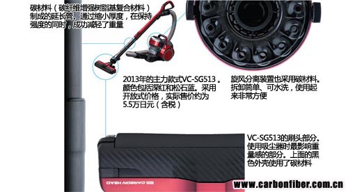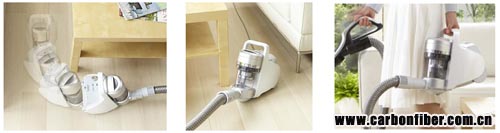 碳材料應(yīng)用到了刷頭罩、延長(zhǎng)管、旋風(fēng)分離裝置3個(gè)部位。與使用碳材料之前的款式相比,延長(zhǎng)管與刷頭相加,重量減輕了約300克。再加上采用小直徑喉管,喉管、延長(zhǎng)管、刷頭的總重量減輕了500克左右,約占總重量的25%。