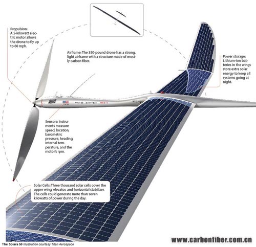 Solara 50采用碳纖維復(fù)合材料主體結(jié)構(gòu),并大量運(yùn)用了玻纖和芳綸纖維等材料以實(shí)現(xiàn)機(jī)身減重。Google和Titan認(rèn)為,該機(jī)型通過搭載電子通訊設(shè)備,可稱為移動(dòng)的互聯(lián)網(wǎng)接入平臺(tái),并在探測(cè)、救災(zāi)領(lǐng)域發(fā)揮重要作用。該機(jī)型預(yù)計(jì)在2014年年內(nèi)實(shí)現(xiàn)首飛。