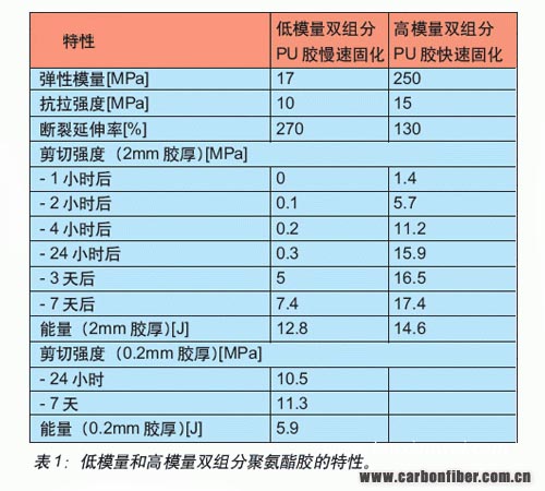 在汽車組裝過(guò)程中粘結(jié)部件時(shí),雙組分聚氨酯結(jié)構(gòu)膠比較合適。這種膠可以加工成具有不同模量和斷裂伸長(zhǎng)率。表1列出了兩種硬化率不同、彈性模量有低有高的雙組分聚氨酯結(jié)構(gòu)膠的性能曲線。
