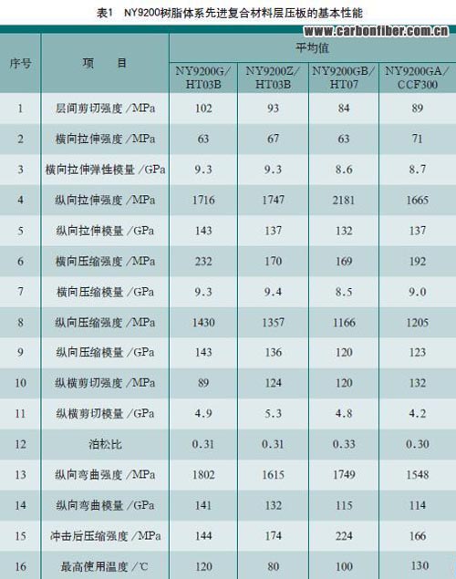 為提高和穩(wěn)定先進復合材料的成型質(zhì)量,降低先進復合材料的制造成本,我們根據(jù)不同的復合材料結(jié)構(gòu)件研制開發(fā)了中高溫度固化、韌性不同的NY9200環(huán)氧樹脂體 系,原材料均為國產(chǎn),價廉易購;其配制工藝簡單,質(zhì)量穩(wěn)定,可用于濕法或干法預(yù)浸,無污染,易工程化;其預(yù)浸料具有貯存期長,固化溫度帶寬,固化時間短等 優(yōu)點;其先進復合材料具有韌性和機械性能兼優(yōu)的特