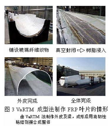VaRTM成型法的特點(diǎn)如圖1所示。VaRTM成型法是指在成形型(成形模具—譯者注)上首先鋪設(shè)強(qiáng)化纖維基材(玻璃纖維或碳纖維等編織物),用塑料薄膜封閉后再抽成真空,然后將液狀樹(shù)脂注入,由負(fù)壓原理使其完全浸入纖維基材各處并使其硬(固)化。這種FRP的成型法也是PTM法的一種。為方便樹(shù)脂浸入(擴(kuò)散)及獲得較好的葉片表面,在強(qiáng)化纖維基材與成形型以及塑料薄膜之間分別使用了專(zhuān)用的網(wǎng)狀罩布和剝離罩布。 123456