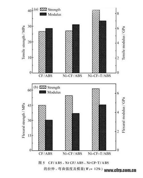 圖5(a)是未鍍鎳碳纖維(CF)以及不使用和使用偶聯(lián)劑處理的鍍鎳碳纖維(Ni-CF)分別與ABS復(fù)合制得的復(fù)合材料(分別簡(jiǎn)寫為CF/ABS、Ni-CF/ABS、Ni-CF-T/ABS)的拉伸強(qiáng)度和拉伸模量(碳纖維質(zhì)量分?jǐn)?shù)為12%)。從圖5(a)可以看出,經(jīng)鈦酸酯偶聯(lián)劑處理過的Ni-CF-T/ABS的拉伸強(qiáng)度和拉伸模量均比其他2種復(fù)合材料高,分別為41MPa和7GPa。CF/ABS和Ni-CF/ABS的拉伸強(qiáng)度相差不多,為27MPa左右;拉伸模量分別為6GPa和6.5GPa。Ni-CF/ABS的拉伸性能略高于CF/ABS。