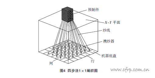近年來,許多學者對矩形編織材料細觀結(jié)構(gòu)給予了高度的關(guān)注,逐步建立了由簡單“米”字型到三維實體的單胞幾何模型,推動著力學模型的發(fā)展。鄭錫濤和葉天麒[13]系統(tǒng)地研究了四步法1×1方型編織工藝編制的預成形件及其增強的復合材料的細觀結(jié)構(gòu)。提出了紗線橢圓形橫截面假設(shè),考慮了編織紗線的細度和編織紗線填充因子的影響,創(chuàng)建了正軸模型。根據(jù)編織過程中攜紗器的運動軌跡特點,將預成形件劃分為三個不同的區(qū)域,分別定義了不同的控制體積單元,識別了編織結(jié)構(gòu)參數(shù)之間的關(guān)系,同時給出三維編織復合材料的設(shè)計方法,三維編織示意圖見圖4。馮偉和馬文鎖[14]將編織物中連續(xù)的紗線離散開來并用特殊的點符號表達,用點群和空間群分析現(xiàn)有編織材料幾何結(jié)構(gòu),一方面可以合理地對現(xiàn)有編織材料幾何結(jié)構(gòu)進行描述和分類;另一方面也可以將該理論用于推導編織材料幾何結(jié)構(gòu)新的和更為有效的編織方法。張美忠等[15]由于編織復合材料實際結(jié)構(gòu)的復雜性,為了使研究結(jié)果更真實,用現(xiàn)有成熟的有限元軟件仿真三維編織復合材料,并研究其各項力學性能已成為一種趨勢。