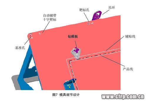 (4) 靶標(biāo)孔:用于手動鋪貼時放置激光投影的靶標(biāo),以定位鋪層區(qū)域。靶標(biāo)孔按實(shí)測值即可,坐標(biāo)值刻于模具上。