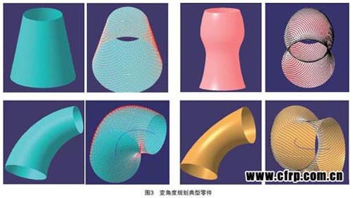 目前,我們提出了一種新的變角度軌跡規(guī)劃算法,可實(shí)現(xiàn)錐殼類零件、外殼類零件及變截面接頭類零件的加工制造,如圖3所示。變角度軌跡規(guī)劃算法在上述零件的具體實(shí)現(xiàn)中,其最大優(yōu)點(diǎn)是避免了除零件端面外的剪切與重送,可簡(jiǎn)化纖維鋪放過程,提高加工效率。同時(shí),改變初始鋪放角,還可以改變零件的固有頻率,對(duì)改善整體系統(tǒng)的共振,具有一定的作用。