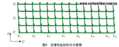 對(duì)復(fù)合材料固化工裝而言,工裝型面的變形將直接影響與其接觸的復(fù)合材料制件的成型質(zhì)量,垂直型面方向的翹曲變形將直接影響到大尺寸復(fù)合材料成型的曲率精度,所以型面變形場(chǎng)的表征方法應(yīng)該與型面的變形直接相關(guān)。為對(duì)成型工裝的型面變形量進(jìn)行表征,所用支撐柱如圖5所示。