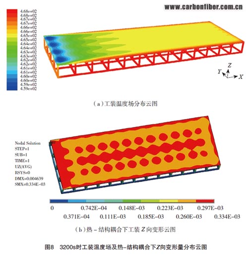 在復(fù)合材料的熱壓罐固化過(guò)程中,對(duì)柱支撐形式的固化工裝型面,溫度不均勻性導(dǎo)致的型面翹曲變形較為復(fù)雜。在工裝結(jié)構(gòu)內(nèi)部,支撐柱存在位置所對(duì)應(yīng)型面的局部變形量大于沒(méi)有支撐柱存在的位置,這是因?yàn)橹沃鶎?duì)空氣的擾流作用加快了支撐柱與周圍空氣之間的熱傳遞。圖8為3200s時(shí)工裝溫度場(chǎng)及Z向結(jié)構(gòu)變形量分布云圖。