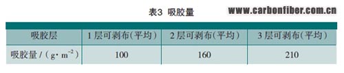 大型復(fù)合材料壁板因?yàn)楹穸茸兓螅愿鱾€(gè)區(qū)域余膠量分布不均,在制件制備過程中則要通過預(yù)吸膠環(huán)節(jié)控制各個(gè)區(qū)域厚度在標(biāo)準(zhǔn)范圍之內(nèi),這就要求我們對(duì)預(yù)吸膠工藝進(jìn)一步掌握。吸膠材料和吸膠時(shí)間是對(duì)吸膠量的關(guān)鍵影響因素,如表3和圖3所示。