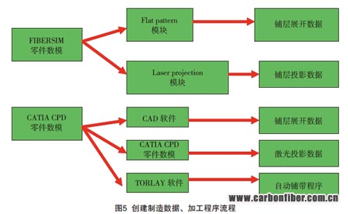 通過構(gòu)建復(fù)合材料數(shù)字化制造技術(shù)的軟件平臺(tái),采用專用設(shè)計(jì)、工藝軟件建立復(fù)合材料零件三維數(shù)模(工程數(shù)據(jù)),進(jìn)而建立制造數(shù)據(jù)集、程序,實(shí)現(xiàn)與自動(dòng)下料機(jī)、投影定位、自動(dòng)鋪帶機(jī)等數(shù)字化設(shè)備的接口,為復(fù)合材料數(shù)字化制造技術(shù)應(yīng)用打下基礎(chǔ),如圖5所示。