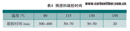 加壓點(diǎn)包括加壓溫度、加壓時(shí)機(jī)。加壓點(diǎn)的選擇, 首先是加壓溫度,加壓溫度過低則樹脂流動(dòng)性不好,纖維不易均勻浸潤(rùn)易造成缺陷;加壓溫度過高,樹脂聚合速率過快不易掌握加壓時(shí)機(jī)。其次在確定加壓溫度的前提下把握好加壓時(shí)機(jī),加壓時(shí)機(jī)過早則樹脂粘度低,排出樹脂過多造成零件貧膠、孔隙率高;加壓時(shí)機(jī)過晚則樹脂聚合程度高,流動(dòng)性差制件易夾雜氣泡產(chǎn)生疏松、分層等缺陷。加壓點(diǎn)的最佳選擇為樹脂由粘流態(tài)向高彈態(tài)轉(zhuǎn)變過程中的過渡區(qū)間。這和升溫速率、加壓溫度、加壓時(shí)機(jī)都密切相關(guān),不同的溫度—時(shí)間曲線有著不同的加壓點(diǎn)。目前經(jīng)常采用差熱分析儀和流變儀來(lái)了解樹脂的固化反應(yīng)過程和粘度變化過程,實(shí)際生產(chǎn)中也有用滑板法或拉絲法測(cè)定凝膠時(shí)間來(lái)了解樹脂在溫度—時(shí)間曲線各個(gè)點(diǎn)的粘度情況,如表4、表5所示。