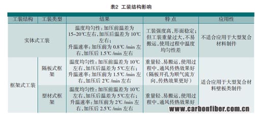 不同結(jié)構(gòu)形式的工裝,結(jié)合復(fù)合材料零件的實(shí)際制造情況,對(duì)復(fù)合材料的成型工藝過程會(huì)產(chǎn)生不同的影響,尤其是對(duì)復(fù)合材料零件固化過程中的加熱效率以及溫度均勻性的影響。具體情況如表2所示。