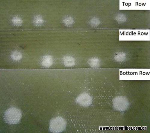 圖3 在采用鉤/環(huán)搭接的“互鎖型”Han-3D玻璃纖維織物(上)以及具有同樣重量的“非互鎖型”平織玻璃纖維織物(下)上所做的低速碰撞測試,兩種織物都是按0°、+45°、-45°、90°、0°、-45°、+45°和0°的順序依次鋪層、并由亨斯邁先進材料公司的Aradur 5003-1環(huán)氧樹脂進行真空灌注的一個8層織物。將試樣放入一個中心孔直徑為50mm的試驗夾具中,采用一個頭部直徑為12.7mm的沖擊桿在試樣的多處擊打數次(落錘1kg,落差80cm)。可以看出,采用Han-3D織物生產的復合材料上的凹痕相對較小,中間一排顯示出了僅在試驗夾具的落差由80cm降低到40cm后,平織的試樣上就出現了較小的凹痕印記