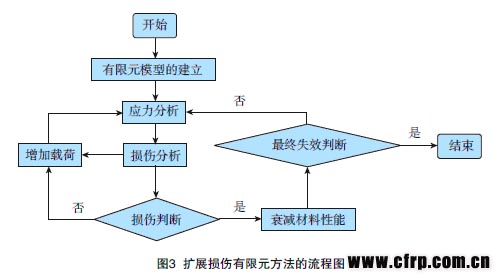 挖補(bǔ)修理有限元研究方法在過去的20年里取得了很大的發(fā)展。已經(jīng)從過去簡(jiǎn)單的2維研究發(fā)展為3維有限元仿真研究。材料的失效判斷也從過去簡(jiǎn)單判斷破壞與否的蔡-吳、蔡-希爾失效判據(jù)發(fā)展完善為目前常采用的能夠區(qū)分材料多種不同失效模式(纖維斷裂、基體開裂、纖維-基體剪切破壞和分層破壞)的Hashin失效判據(jù)。目前,修理結(jié)構(gòu)有限元仿真研究的最常用方法為擴(kuò)展損傷方法。圖3即為擴(kuò)展損傷方法的運(yùn)算流程圖。