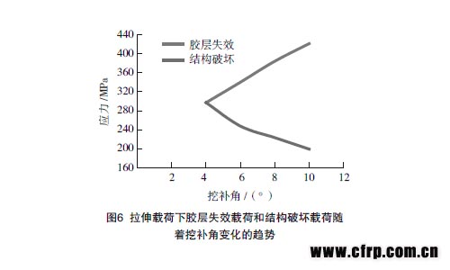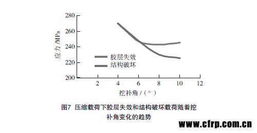 隨著挖補(bǔ)修理研究的不斷發(fā)展,目前最新的研究結(jié)果表明:挖補(bǔ)修理結(jié)構(gòu)的失效包括膠層的失效和結(jié)構(gòu)的破壞,而挖補(bǔ)角對(duì)膠層失效和結(jié)構(gòu)破壞的影響并不相同。如圖6所示,隨著挖補(bǔ)角度的增大,膠層的失效載荷在不斷減少而結(jié)構(gòu)的破壞載荷卻在不斷增加。4°時(shí)膠層的失效載荷與結(jié)構(gòu)的破壞載荷相同,此時(shí)的角度即為拉伸載荷下挖補(bǔ)修理的最佳挖補(bǔ)角。通過研究,同樣也可以得到壓縮載荷下膠層失效和結(jié)構(gòu)破壞載荷隨挖補(bǔ)角變化的趨勢(shì)(圖7),并得到壓縮載荷下挖補(bǔ)修理的最佳挖補(bǔ)角6°。與試件受到單一拉伸載荷或壓縮載荷不同,一般實(shí)際修理結(jié)構(gòu)使用時(shí)即會(huì)受拉伸載荷也會(huì)受壓縮載荷,因此綜合考慮可以得到飛機(jī)修理結(jié)構(gòu)的最佳挖補(bǔ)角為6°。