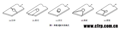 其中拉伸失效、剪切失效以及擠壓失效是因承受面內(nèi)載荷而發(fā)生的;當(dāng)承受面外載荷時,緊固件還可能從接頭中拉出,即所謂的“拉脫”。層板的拉伸失效與基體和纖維的拉伸失效有關(guān),通常發(fā)生于寬徑比很小,或者旁路載荷與緊固件承載比較大時。剪切破壞和擠壓破壞則主要是由纖維和基體的壓縮破壞引起的。拉伸破壞與剪切破壞是災(zāi)難性的,而擠壓破壞則是隨載荷和時間慢慢累積的,是結(jié)構(gòu)局部的失效,不會帶來結(jié)構(gòu)的災(zāi)難性破壞[8]。在以上幾種破壞模式的基礎(chǔ)上,隨載荷及時間的變化,當(dāng)結(jié)構(gòu)擠壓破壞后,還可能發(fā)生一系列后續(xù)的破壞[9],如圖1中的(d)和(e)所示。實際應(yīng)用中復(fù)材接頭可能存在多種破壞模式,發(fā)生混合破壞,使得接頭設(shè)計和分析更加困難[10]。