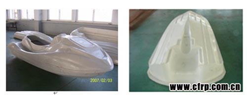 艇身smc模壓常見的缺陷主要包括重量超標或者過小、表面出現(xiàn)裂紋、表面光潔度不夠、表面顏色不均勻且有些部位出現(xiàn)黃色、脫模不順暢有時出現(xiàn)粘模的現(xiàn)象。針對上述情況在試模時的填料在理論計算的基礎上通過工藝試驗驗證的方法進行合理的控制,同時配制樣板在smc板料的基礎上對填料進行控制下料稱重。模具表面溫度通過溫度測量計對多處關鍵點的溫度進行測量,根據(jù)溫度分布均勻的需要,對模具加溫和流道等進行合理的設計制造來保證,在設計初期可通過有限元模擬的方法對流道進行傳熱分析模擬優(yōu)化設計,有效的保證了模壓時模具溫度的均勻一致性。針對模壓后,由于產(chǎn)品取出后為高溫達120o左右狀態(tài),因此對脫模后的產(chǎn)品為保證產(chǎn)品的外形和減小冷卻過程中的變形,通過校形鋪放工裝有效的保證了產(chǎn)品的外觀尺寸精度一致性要求。如下圖所示為艇身模壓出的實物圖,經(jīng)過裝配粘接與水上試驗,通過smc成型的方式,不僅有效的減輕了整艇的重量,同時有效的保證了產(chǎn)品的密封性、行駛的穩(wěn)定性和使用強度與疲勞要求,如圖4所示為壓制成型合格后的實物。